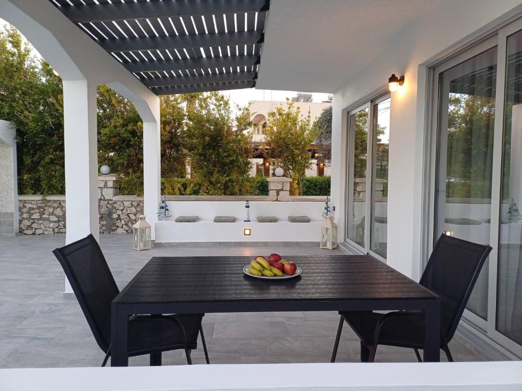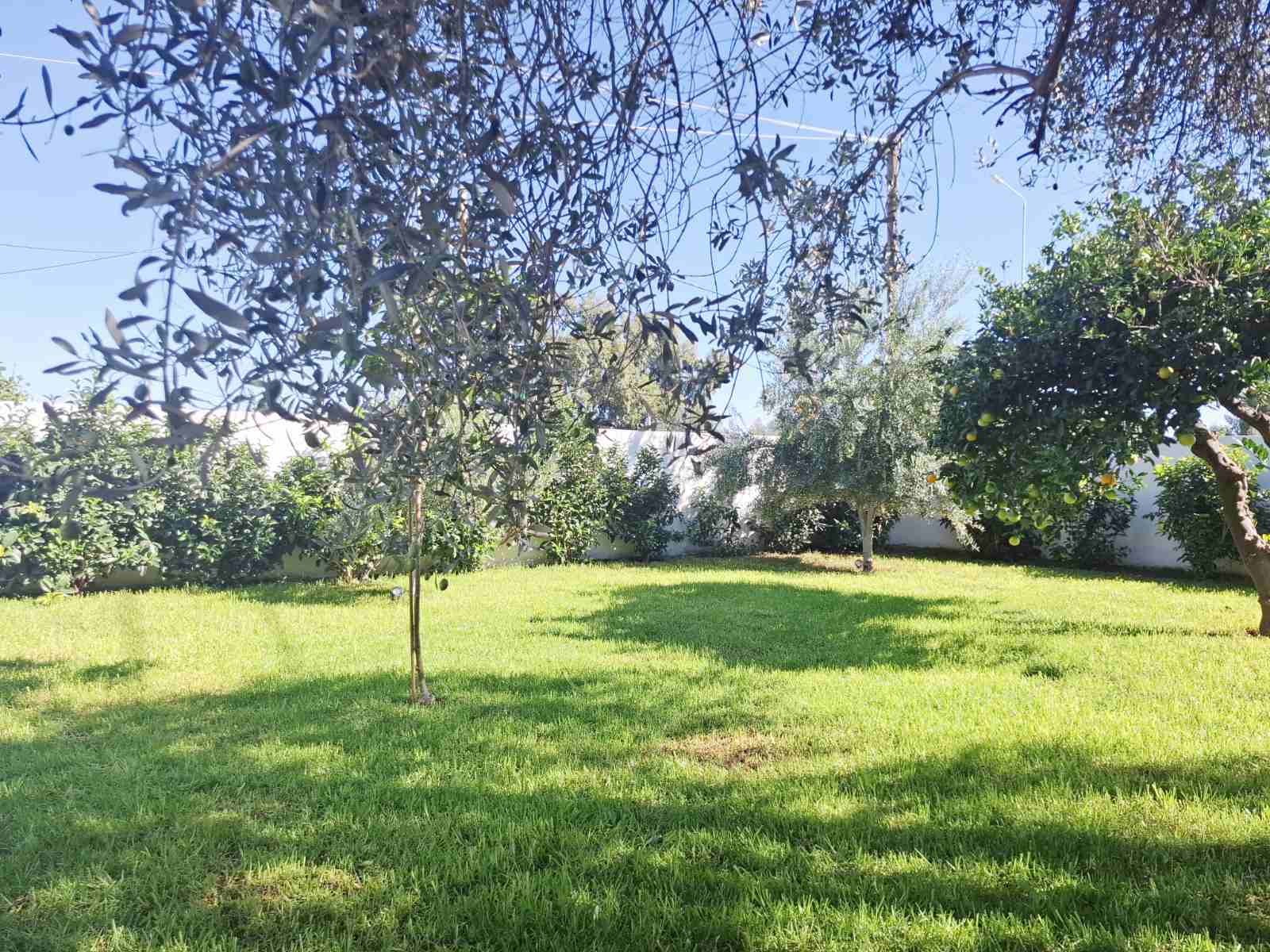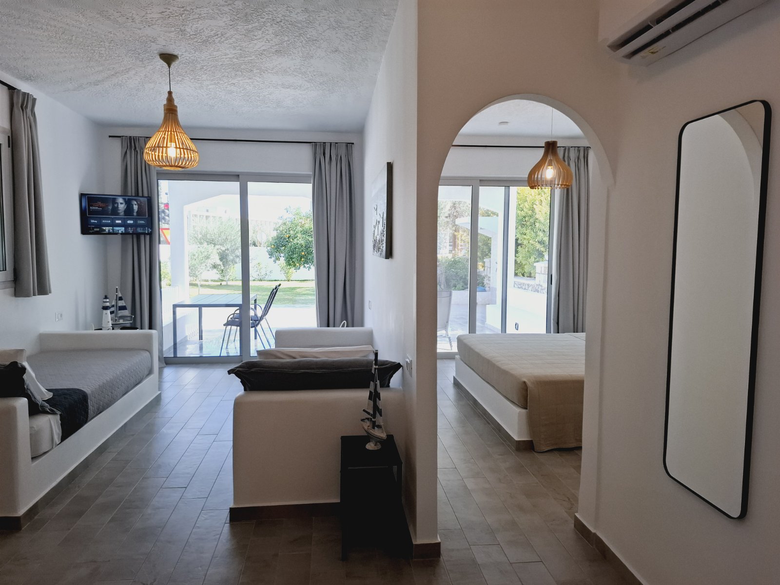 - A large courtyard with comfortable sofas, dining table, chairs and sunbeds.